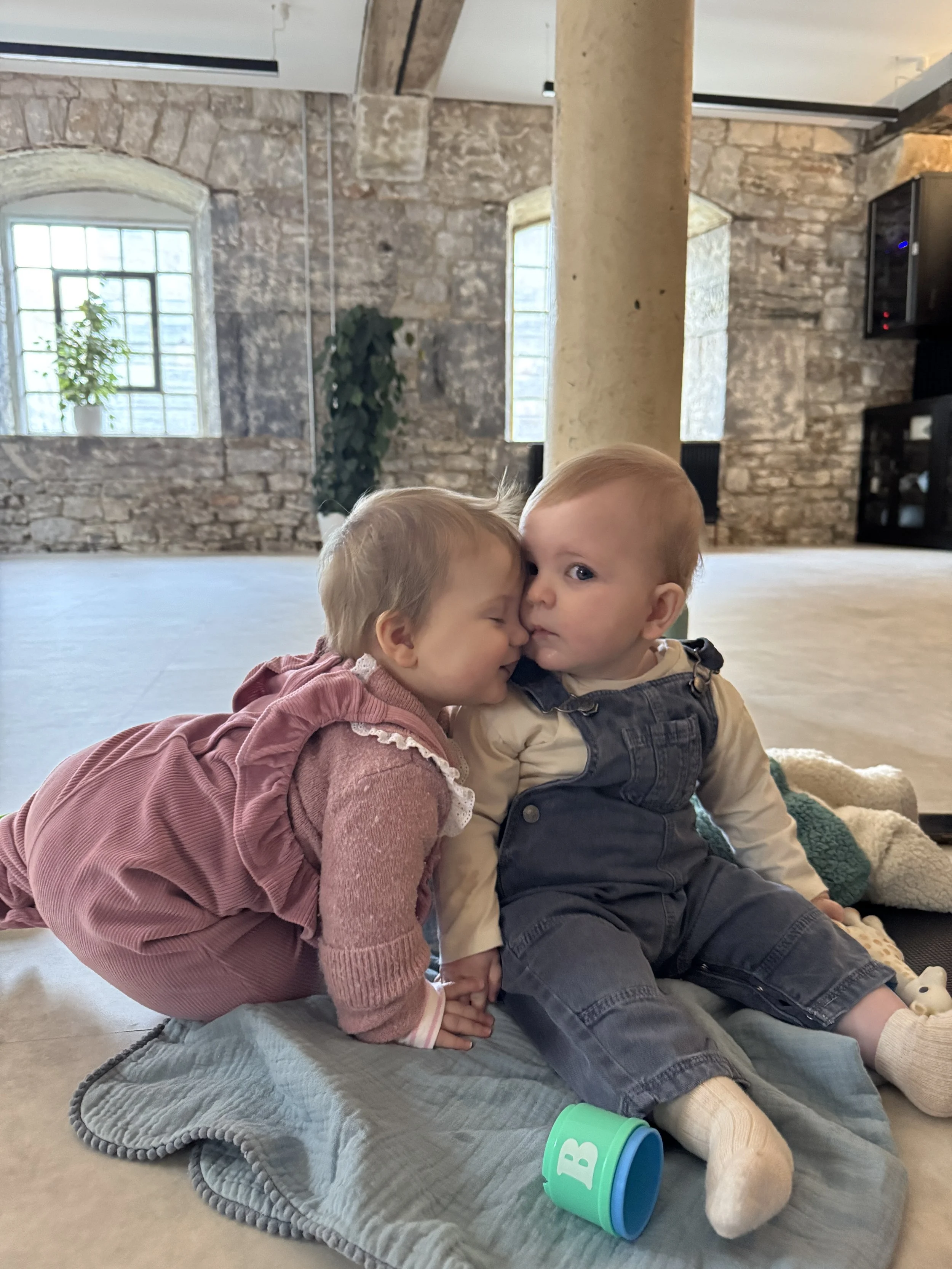 A relaxed, playful family Yoga class at Block Gym Studio, Plymouth - designed for babies, toddlers and their grown ups to move, connect and regulate together.